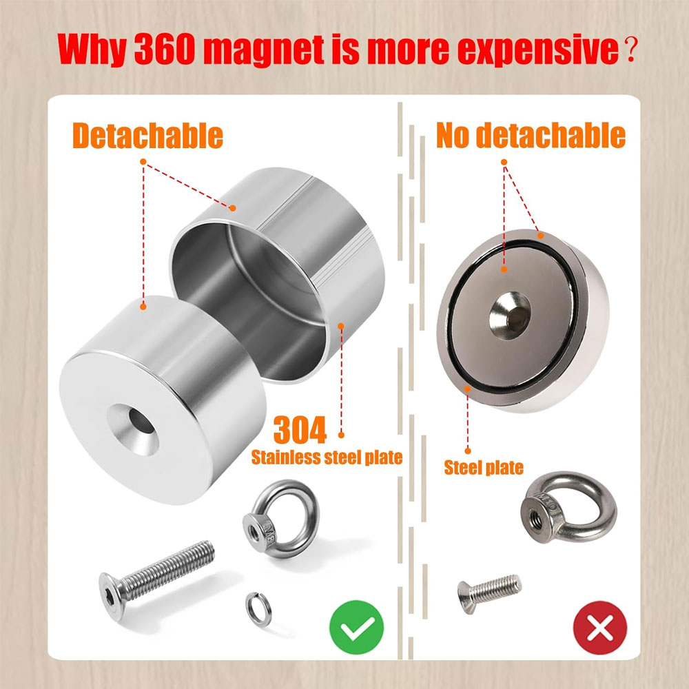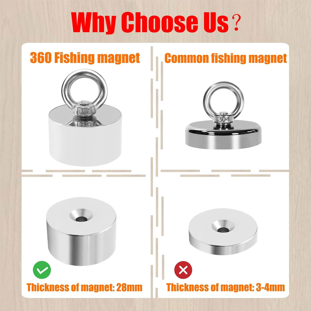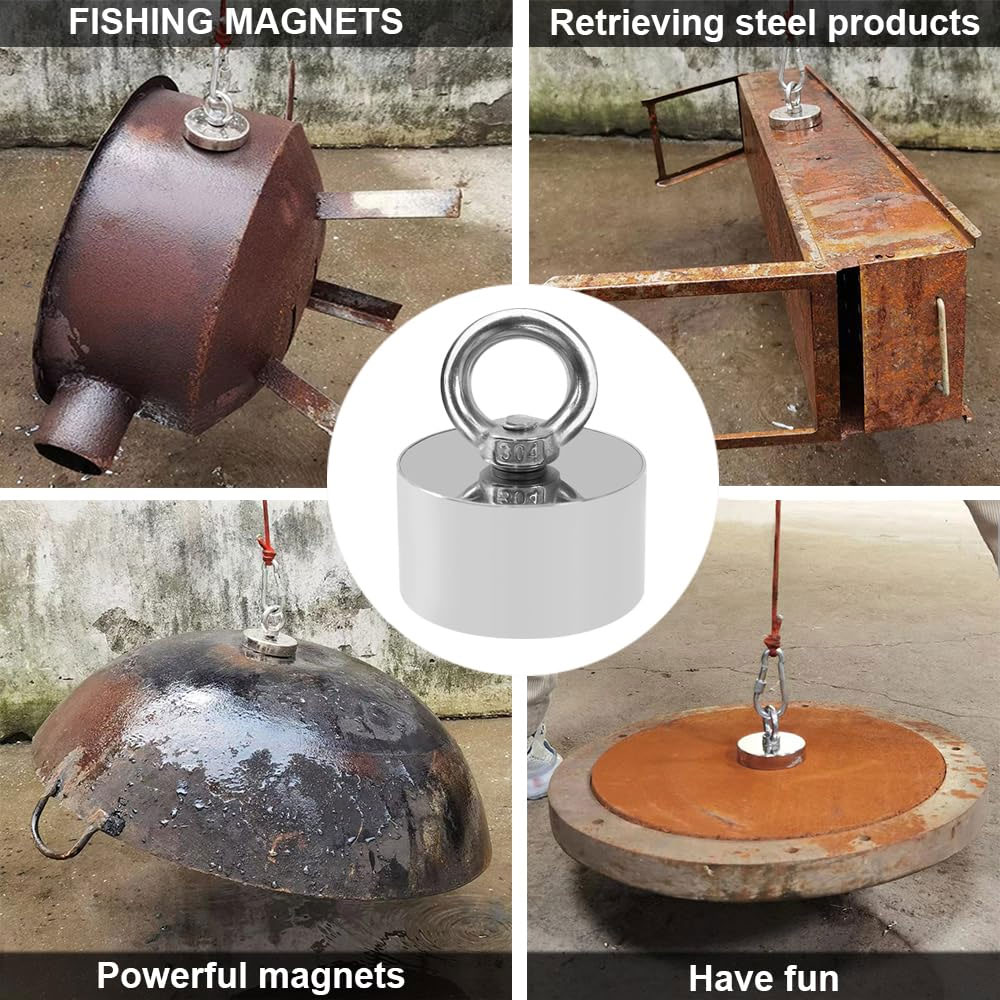 To achieve its estimated 1,000 pounds of top-to-bottom pull force, this fishing magnet has a 2.16" diameter and 1.18" thickness, consisting of N52 neodymium set in a rust-resistant A3 steel cup. On top the steel eye bolt is threaded, and screws directly into the cup.